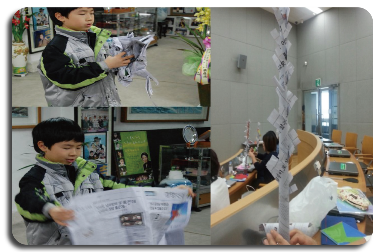 신문지를 여러조각으로 찢었다가 다시 붙이는 마술을 통해 환경보전의 의미와 업사이클의 개념 이해